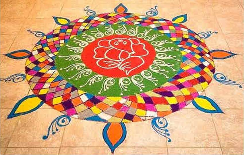 संस्कृति को दर्शाती रंगोली डिजाइन: इस रंगोली में भगवान गणेश की तस्वीर, दीपक और आकर्षक पैटर्न बना सकते हैं।
