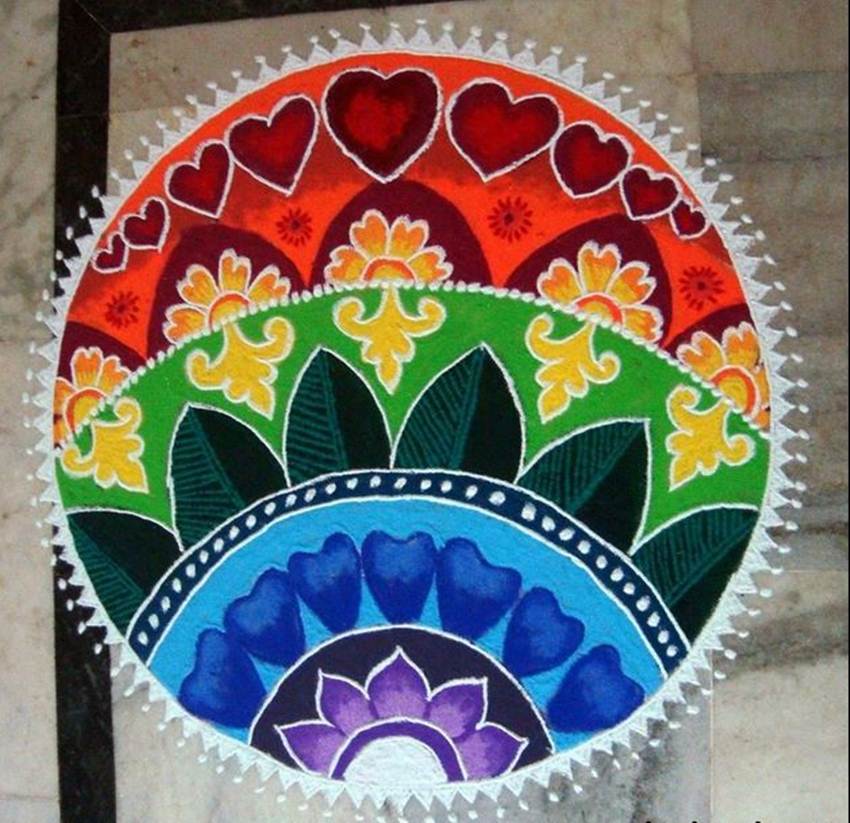 अलग-अलग शेड्स और पैटर्न रंगोली डिजाइन: यह रंगोली काफी सुंदर और आकर्षक लगती है। इस रंगोली में कई रंगों का इस्तेमाल कर अलग-अलग शेड्स बनाए जा सकते हैं।