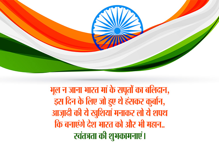 वहीं इस आजादी दिवस के मौके पर हर कोई अपने-अपने तरीके से करीबियों को बधाई देता है। सोशल मीडिया तिरंगे झंडे के रंग में रंगा नजर आता है। आप भी इन खास मैसेजेज और स्टेटस के जरिए दूसरों को शुभकामना संदेश भेज सकते हैं-