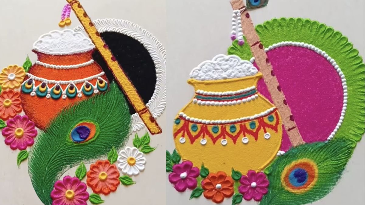 Janmashtami Rangoli Simple Designs Images: पूरे देश में हर साल भगवान श्रीकृष्ण के जन्मोत्सव (Shri Krishna Janmashtami 2025) को धूमधाम से सेलिब्रेट किया जाता है। इस दिन भक्त अपने घरों को फूलों, दीपों और रंग-बिरंगी सजावट से सजाते हैं। इस दिन लोग अपने घर और आंगन में मोरपंख, बांसुरी, मटकी, श्रीकृष्ण के पदचिह्न और झूले जैसे पारंपरिक डिजाइन में रंगोली भी बनाते हैं।