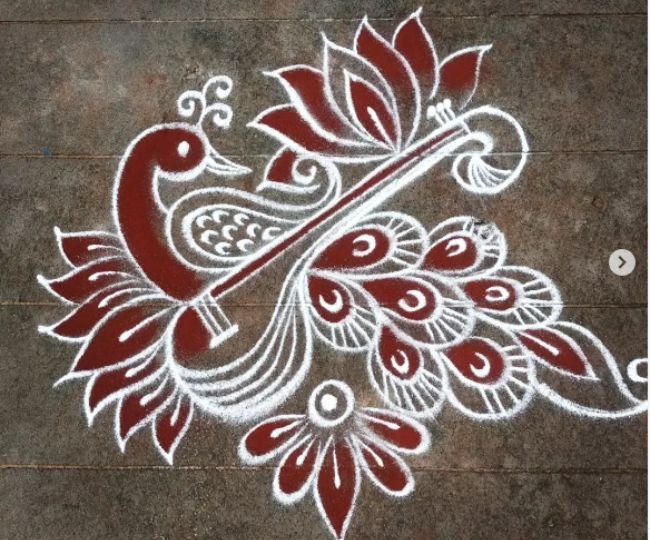 ये रंगोली देखने में काफी खूबसूरत लग रहा है। इसको आप आसानी से बना सकते हैं। इस रंगोली में कई चीजों को एक साथ दिखाया गया है। इसमें कमल का फूल, वीणा और मोर एक साथ देखने को मिल रहा है। इसको आप अपने छत पर बना सकती हैं।