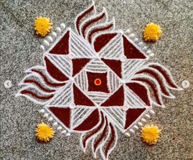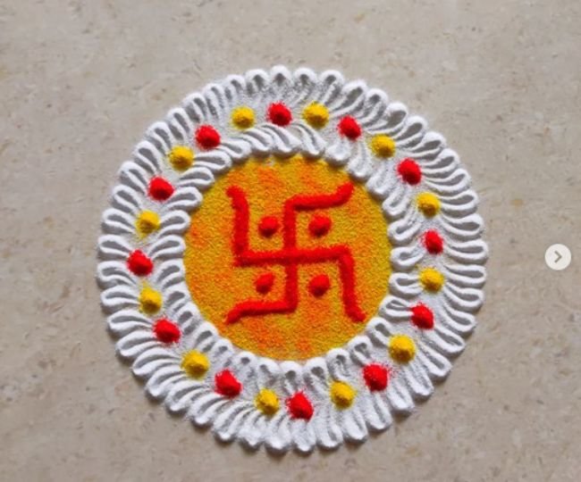 इस रंगोली को आप अपने चौखट के पास बना सकती हैं। ये देखने में यूनिक होने के साथ-साथ सनातन परंपरा को दर्शाने वाला है। स्वास्तिक का चिन्ह घर के बाहर बनाना हमेशा शुभ होता है।