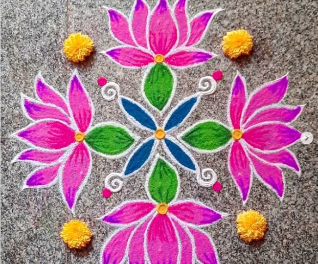 अगर आप सबसे आसान रंगोली की तलाश में हैं तो यह आपके लिए ही है। इस रंगोली को सिर्फ चार रंगों की मदद से बनाया गया है। हालांकि, इसमें सिर्फ दो रंगों का इस्तेमाल बड़े पैमाने पर हुआ है। यह देखने में जितना बेहतर लग रहा है, उतना ही बनाने में आसान है। एक बार बन जाने के बाद इसके चारों तरफ फूल रख सकती हैं, जो इसमें और चार चांद लगा देगा।