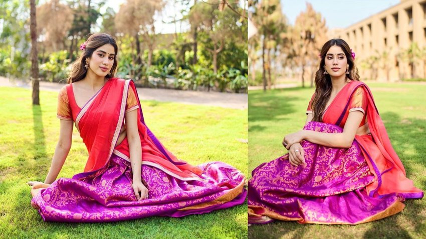 आप जान्हवी कपूर के इस आउटफिट से इंस्प्रिरेशन लेकर तैयार हो सकती हैं। इस तरह का आउटफिट जन्माष्टमी के लिए एकदम परफेक्ट रहने वाला है। इसके लिए आप लॉन्ग स्कर्ट के साथ चोली पेयर कर दुपट्टे को साड़ी के पल्लू की तरह स्टाइल कर सकती हैं।