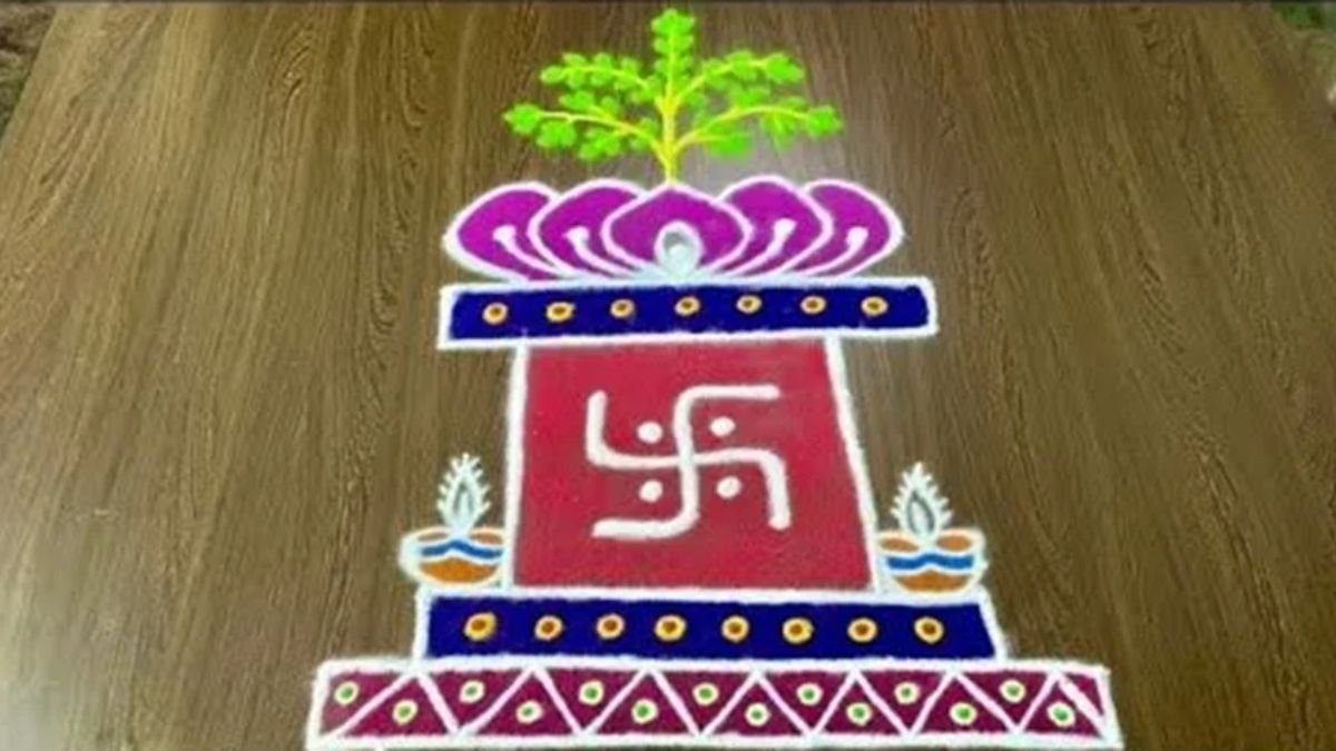 तुलसी विवाह के लिए आप ऐसे स्वास्तिक वाली रंगोली बना सकते हैं।