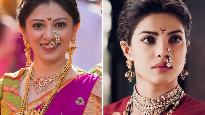 अगर आप ट्रेडिशनल महाराष्ट्रीयन लुक चाहती हैं, तो यह कुंदन नोज पिन आपके लिए एकदम परफेक्ट हो सकता है। गोल्डन बेस और कुंदन की कलाकारी इस नथ को बेहद खास बना रही है।