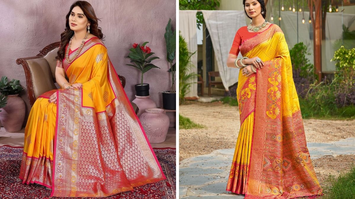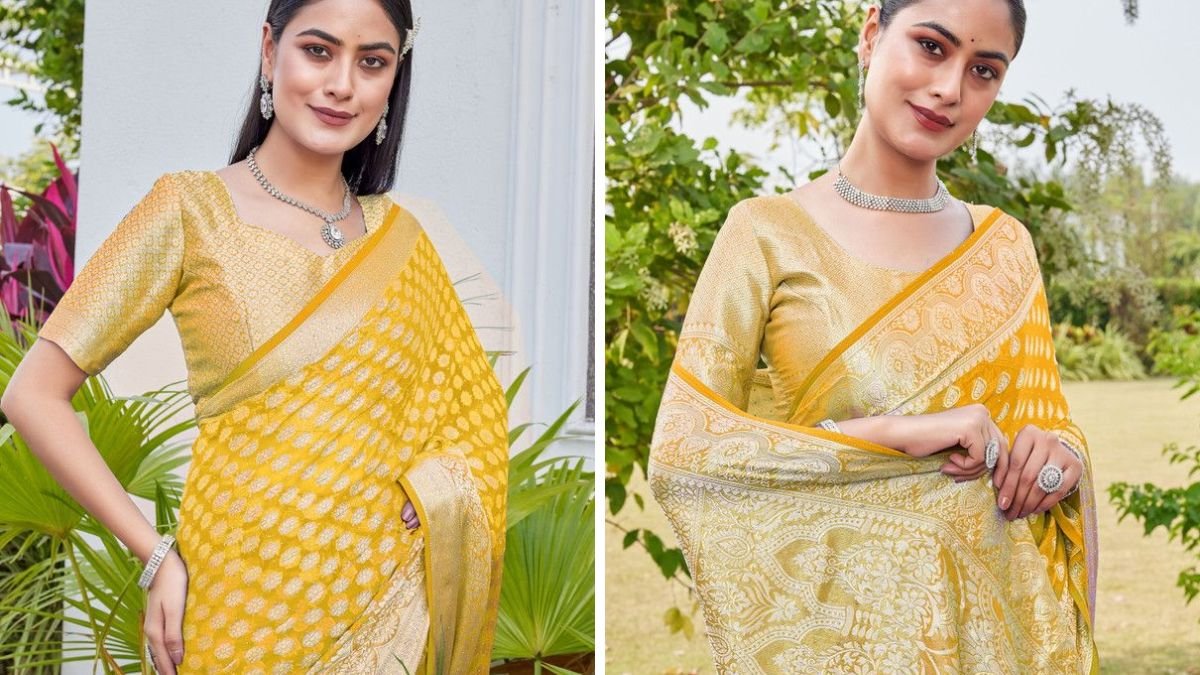 यह येलो प्रिंटेड साड़ी मॉडर्न और ट्रेडिशनल स्टाइल का खूबसूरत मेल है। फ्लोरल मोटिफ्स साड़ी को फ्रेश और ट्रेंडी लुक देते हैं। इसका हल्का टेक्सचर दिनभर आरामदायक रहता है। मकर संक्रांति पर आप इस साड़ी को ट्राई कर सकती हैं।