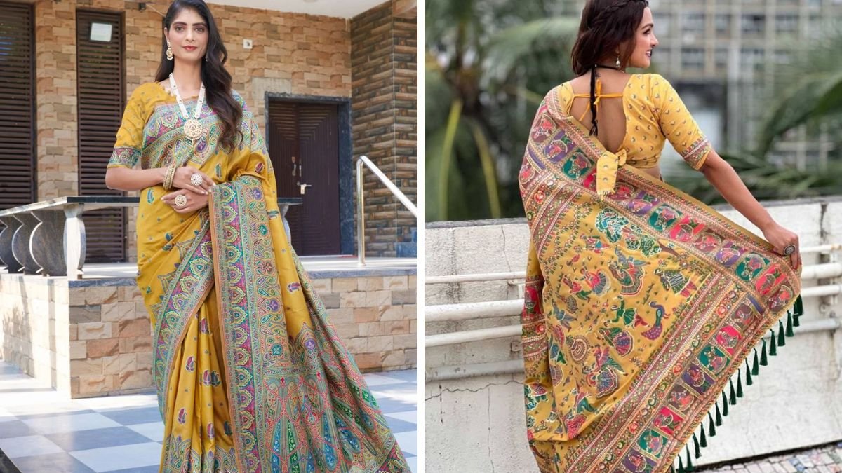 यह प्रिंटेड येलो साड़ी ट्रेडिशनल आर्ट और कलरफुल डिजाइन का बेहतरीन उदाहरण है। चौड़ा बॉर्डर और एथनिक प्रिंट इसे फेस्टिव वाइब देते हैं।