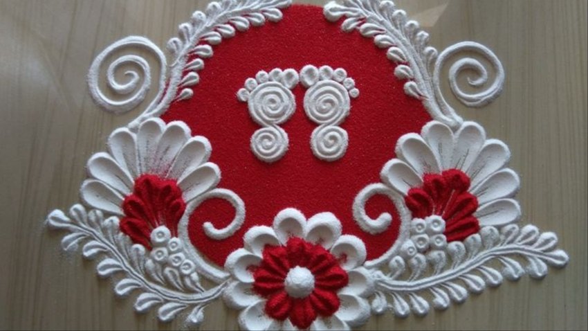 नवरात्रि के तीसरे दिन आप देवी के आगमन पर उनके पैरों को बनाकर उनका स्वागत कर सकते हैं। आप इसे हल्दी, कुकम, अक्षत और फूलों से बना सकते हैं। ये डिजाइन बहुत सुंदर है।