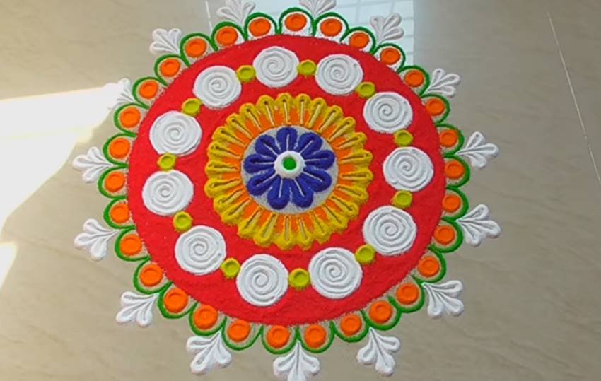 रंगोली की कई सारी डिजाइन्स बहुत ही प्रचलित हैं। नीचे दिखाई गई रंगोली भी बेहद खूबसूरत है। आप इसे बनाने की कोशिश कर सकते हैं।