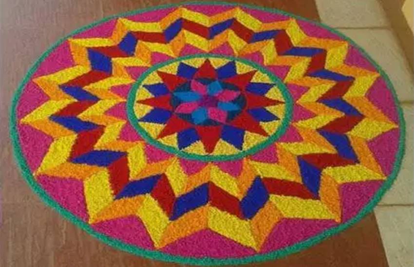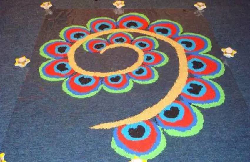 यह रंगोली भी काफी खूबसूरत है। दिवाली के मौके पर आप इसे अपने घर पर बना सकते हैं।