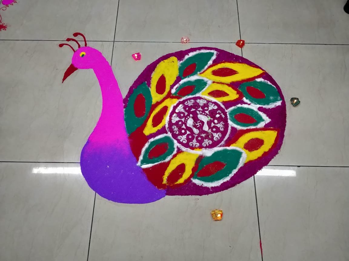 इस रंगोली को रंगोली पाउडर की मदद से बनाया गया है। इस रंगोली को बनाने में बहुत से रंगों का इस्तेमाल किया गया है।