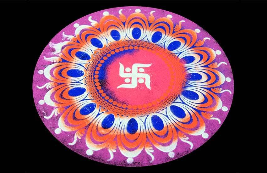 रंगोली बनानी है। आपके पास समय ही नहीं है तब आप सबसे आसान रास्ता ढूंढेंगे। तो आसान तरीका है कि पाउडर रंगों का इस्तेमाल ना कर चॉक का इस्तेमाल कर सकते हैं। इससे गलत होने की संभावना भी कम हो जाती है। इसके साथ ही अगर ज्यादा काम करने से बचना चाहते हैं तो सिर्फ फूलों से स्वास्तिक बना सकते हैं जो देखने में काफी सुंदर लगेगा।