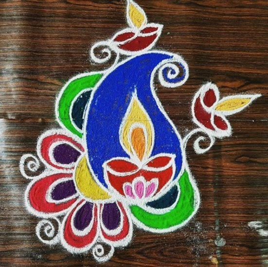 इस रंगोली को बनाने में भी रंगों के पाउडर का इस्तेमाल किया गया है। इसमें दीया भी बना हुआ है।
