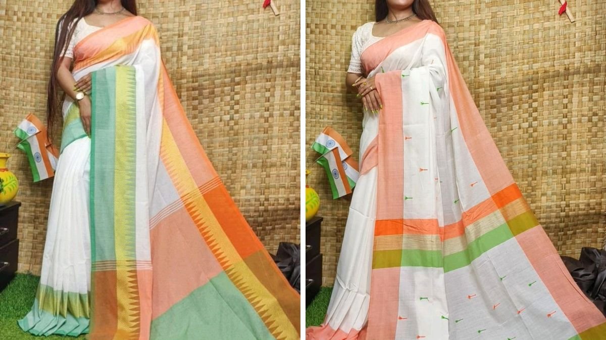 आप तिरंगे रंगों की पल्लू वाली इस साड़ी को भी पहन सकती हैं। सूती या खादी फैब्रिक में बनी यह साड़ी आरामदायक होने के साथ-साथ ट्रेडिशनल फील देती है। गणतंत्र दिवस पर इसे सिंपल ब्लाउज और कम ज्वेलरी के साथ कैरी किया जा सकता है।
