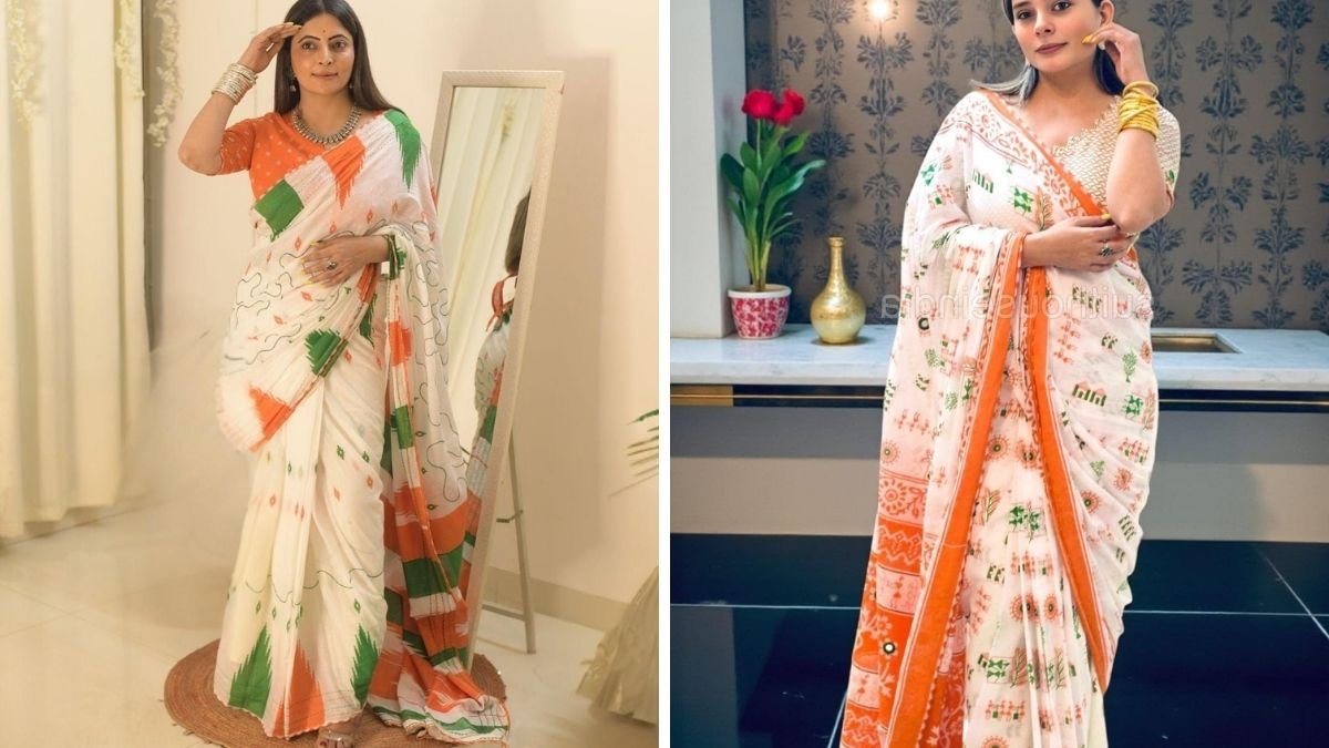 सफेद खादी साड़ी पर बने छोटे तिरंगे मोटिफ इसे बेहद खास बनाते हैं। यह साड़ी सादगी, स्वदेशी भावना और देशभक्ति का प्रतीक है। इसके अलावा, आप अशोक चक्र प्रिंट वाली साड़ी भी पहन सकती हैं।