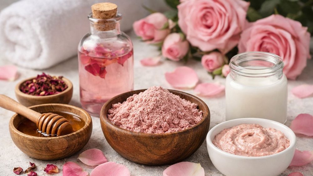 रोज पाउडर गुलाब की पंखुड़ियों से तैयार किया जाता है। इसमें नेचुरल एंटीऑक्सीडेंट, एंटीबैक्टीरियल और एंटी-इंफ्लेमेटरी गुण पाए जाते हैं। ये त्वचा को ठंडक पहुंचाने, जलन कम करने और डलनेस दूर करने में मदद करते हैं।