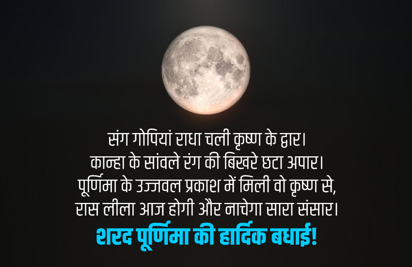 Sharad Purnima 2019 wishes images, pictures, quotes, messages, shayari, status: शरद पूर्णिमा हिंदू कैलेंडर में सबसे प्रसिद्ध पूर्णिमा में से एक है। ऐसा माना जाता है कि शरद पूर्णिमा वर्ष में एकमात्र दिन होता है जब चंद्रमा सभी सोलह कलाओं के साथ बाहर आता है। हिंदू धर्म में, प्रत्येक मानव गुण कुछ कलाओं से जुड़ा हुआ है और यह माना जाता है कि सोलह विभिन्न कलाओं का संयोजन एक आदर्श मानव व्यक्तित्व बनाता है। यह भगवान कृष्ण थे जो सभी सोलह कलाओं के साथ पैदा हुए थे और वे भगवान विष्णु के पूर्ण अवतार थे। भगवान राम का जन्म केवल बारह कलाओं के साथ हुआ था। आज के दिन नव विवाहित महिलाएं पूर्णिमा व्रत का संकल्प लेती हैं। इसके अलावा मान्यता यह भी है कि शरद पूर्णिमा के दिन पांच देवताओं की पूजा की जाती है। जिसमें धन की देवी लक्ष्मी, चंद्र देवता, कुबेर, भगवान शिव और श्रीकृष्ण शामिल हैं।