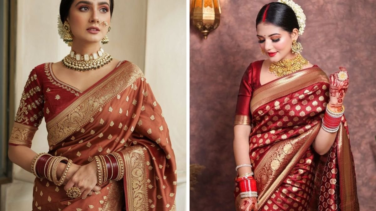दिवाली जैसे त्योहार के लिए यह सिल्क साड़ी एकदम बेहतर है। गहरे रंग की साड़ी पर सुनहरी या सिल्वर बॉर्डर आपके लुक को और भी रॉयल बनाती है। इस साड़ी के साथ आप हैवी नेकपीस पहन सकती हैं और बालों में गजरा भी लगा सकती हैं।