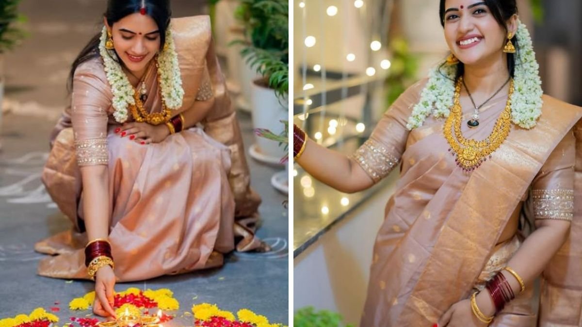 इस दिवाली पारंपरिक और रॉयल लुक पाने के लिए सिल्क साड़ी का यह डिजाइन आपके लिए एकदम परफेक्ट हो सकता है। इसके साथ कॉन्ट्रास्ट ब्लाउज और हैवी ज्वेलरी आपके लुक को और भी ग्रेसफुल बना देंगे।