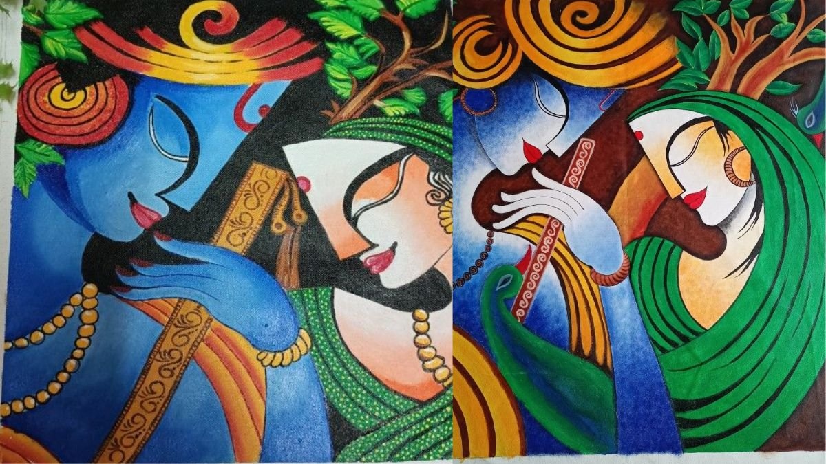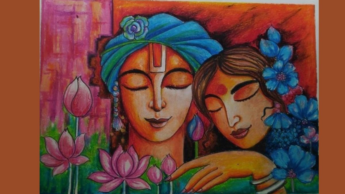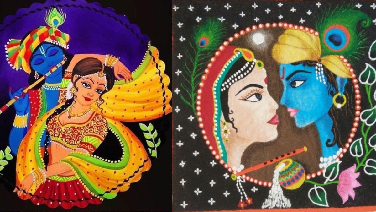 राधा अष्टमी पर बनी यह सुंदर रंगोली राधा-कृष्ण के प्रेम को दर्शा रही है। इसे कमल के फूल और मनमोहक रंगों से बनाया गया है।