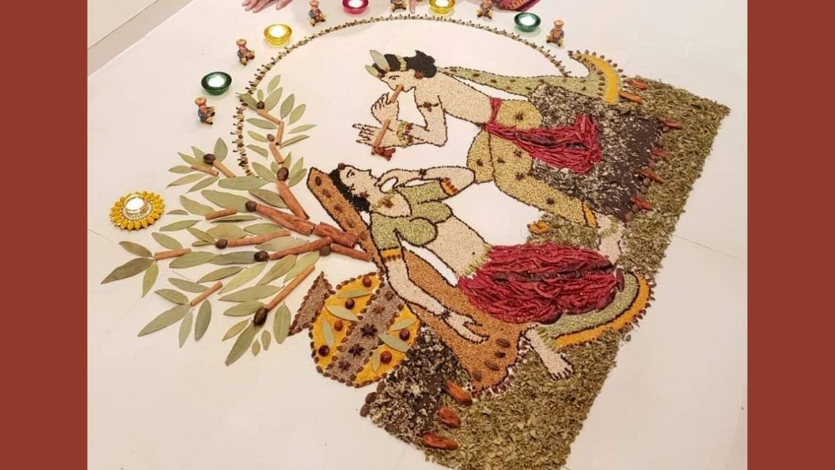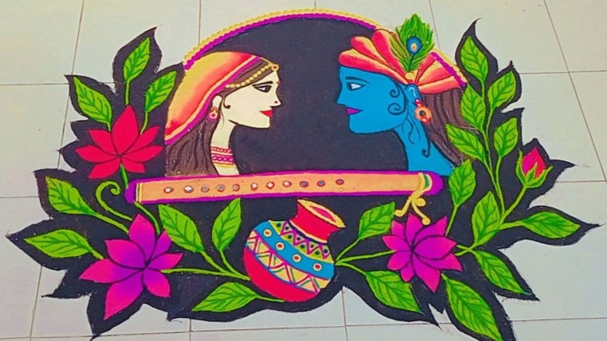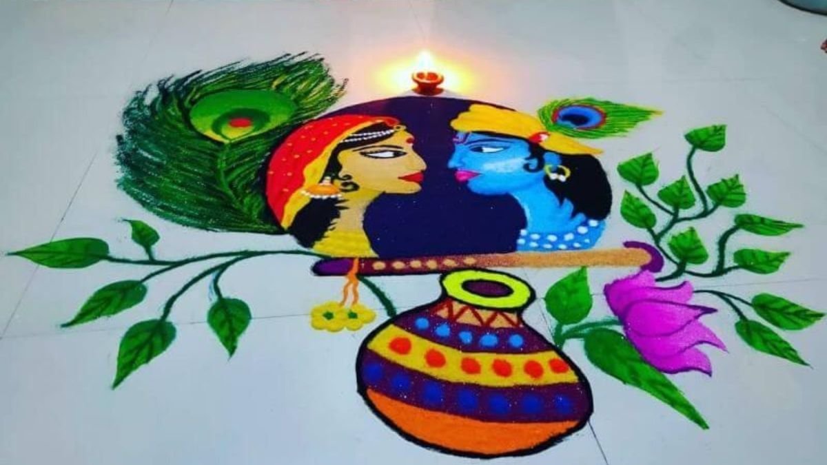 राधा अष्टमी के मौके पर आप इस रंगोली को बना सकते हैं। यह खूबसूरत रंगोली राधा-कृष्ण के दिव्य प्रेम को दर्शाती है। इस रंगोली को मोरपंख, बांसुरी और कलश से मिलाकर तैयार किया गया है।