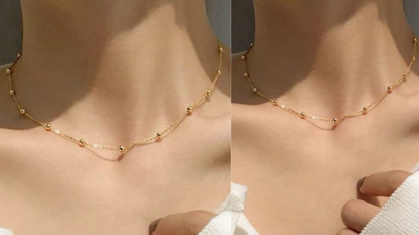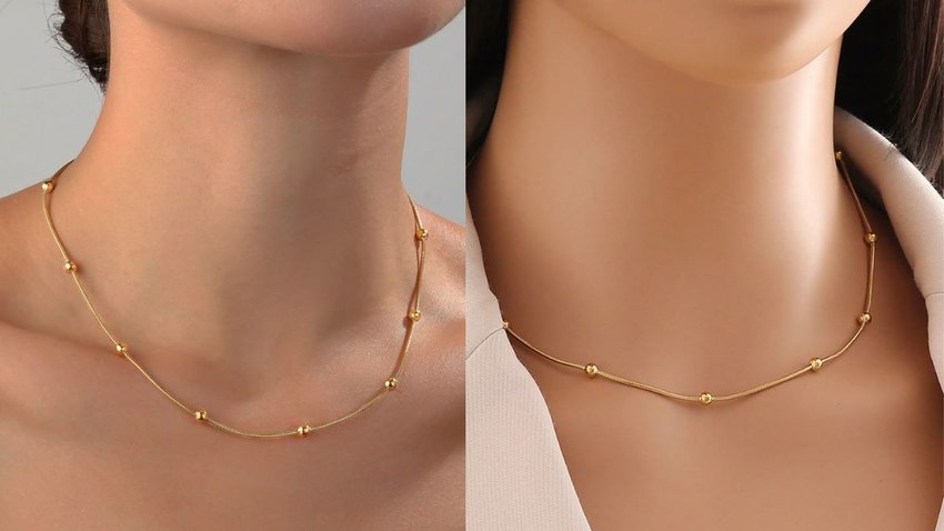 आप अगर सिंपल और लेटेस्ट गोल्ड चैन की तलाश में हैं, तो इस तरह की सोने की चैन को आप ट्राई कर सकती हैं। इस तस्वीर में दिख रही चैन सिंपल और एलिगेंट डिजाइन में तैयार की गई है। इसमें एक पतली गोल्ड वायर पर बराबर दूरी पर छोटे-छोटे गोल्डन बीड्स जड़े हुए हैं, जो इसे एक आकर्षक लुक देते हैं।