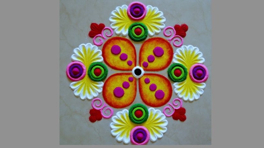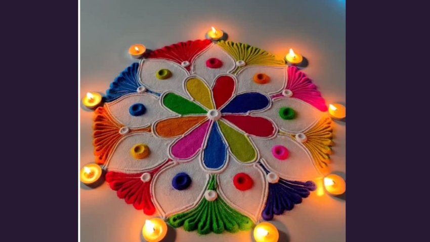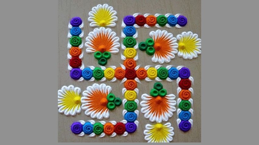 तुलसी विवाह को मौके पर आप इस कलरफुल रंगोली को आसानी से बना सकेत हैं। यह रंगोली देखने में काफी यूनिक लगता है। इसमें आप कई कलर का प्रयोग कर सकते हैं। जब रंगोली पूरा बन जाए तो आप इसके किनारे पर दिये भी रख सकते हैं। इससे यह काफी खूबसूरत भी लगेगा।