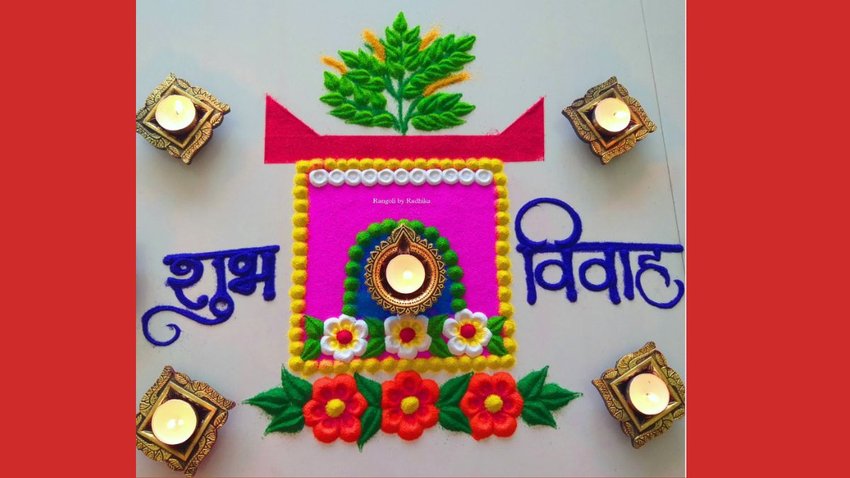 तुलसी विवाह के मौके पर आप इस शुभ विवाह वाले रंगोली को आसानी से बना सकते हैं। इसके लिए आप पीले, हरे और लाल रंगों को मार्केट से ले कर आएं और फिर इसको बनाएं। इस रंगोली में तुलसी का पत्ता भी है, जो इस रंगोली में चार चांद लगा रहा है। रंगोली के किनारे दो दीपक भी जले हुए हैं। आप भी लास्ट में दो दीपक रख सकते हैं।