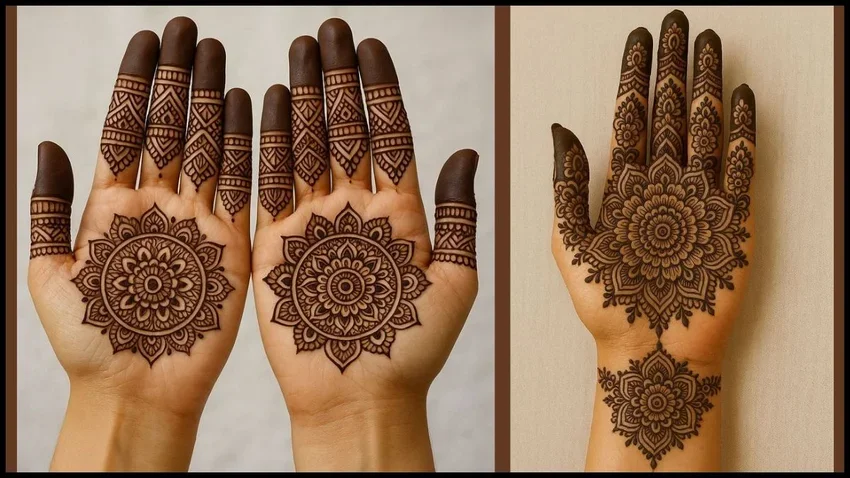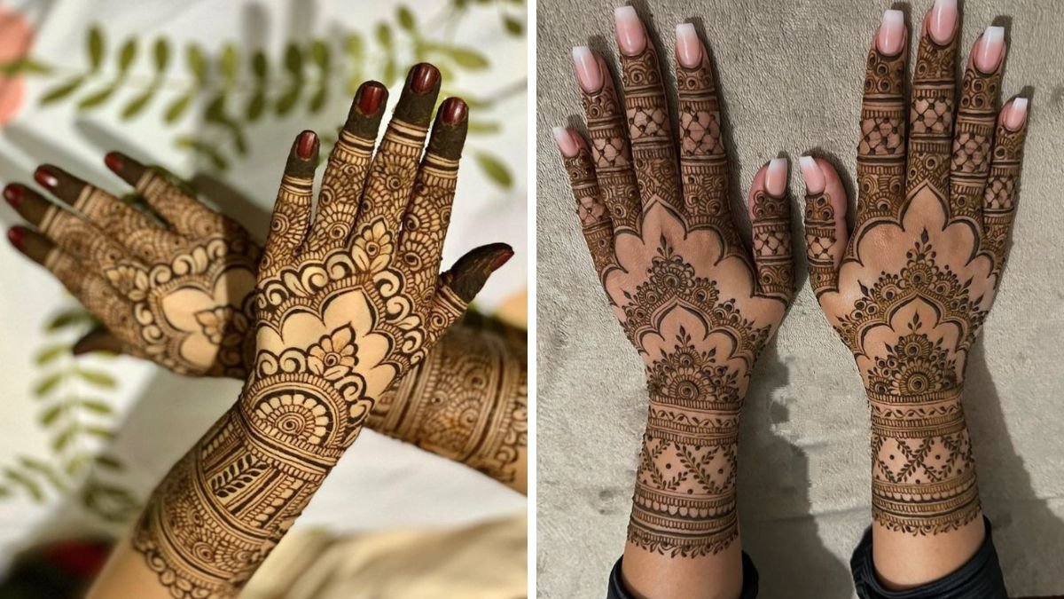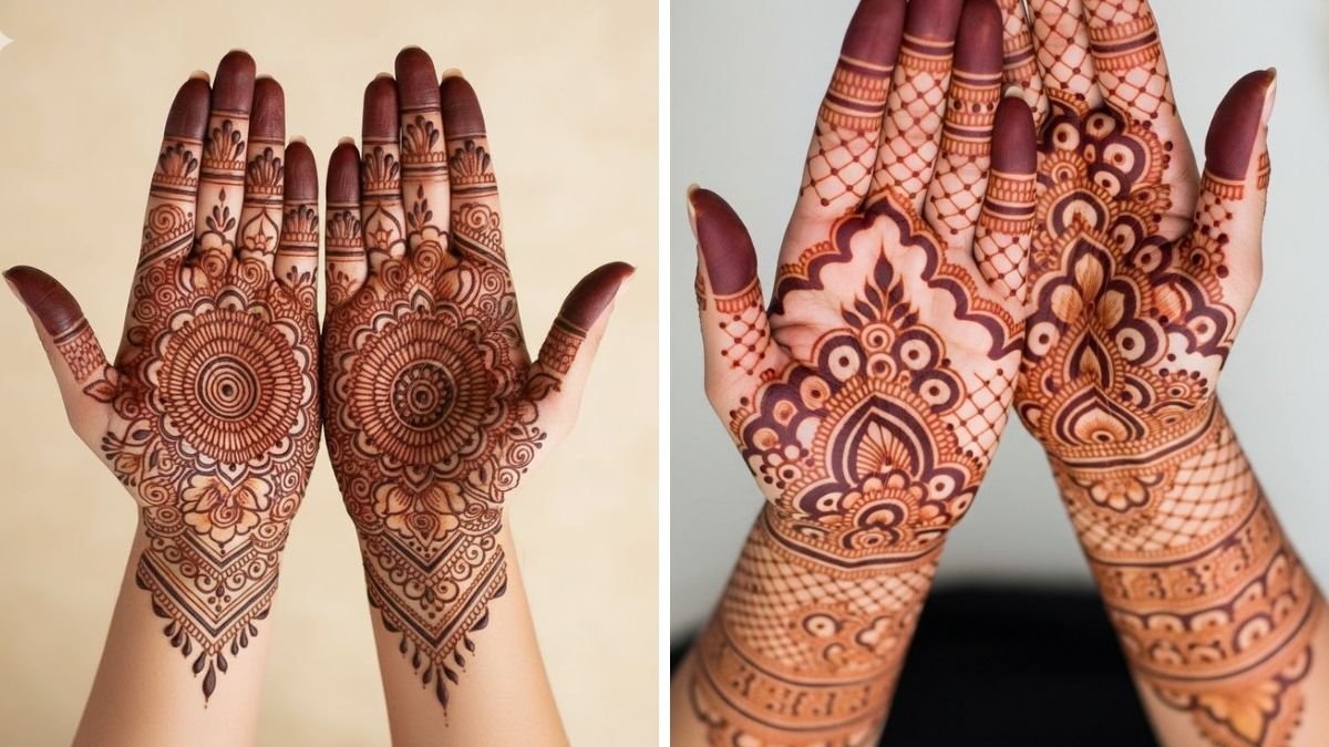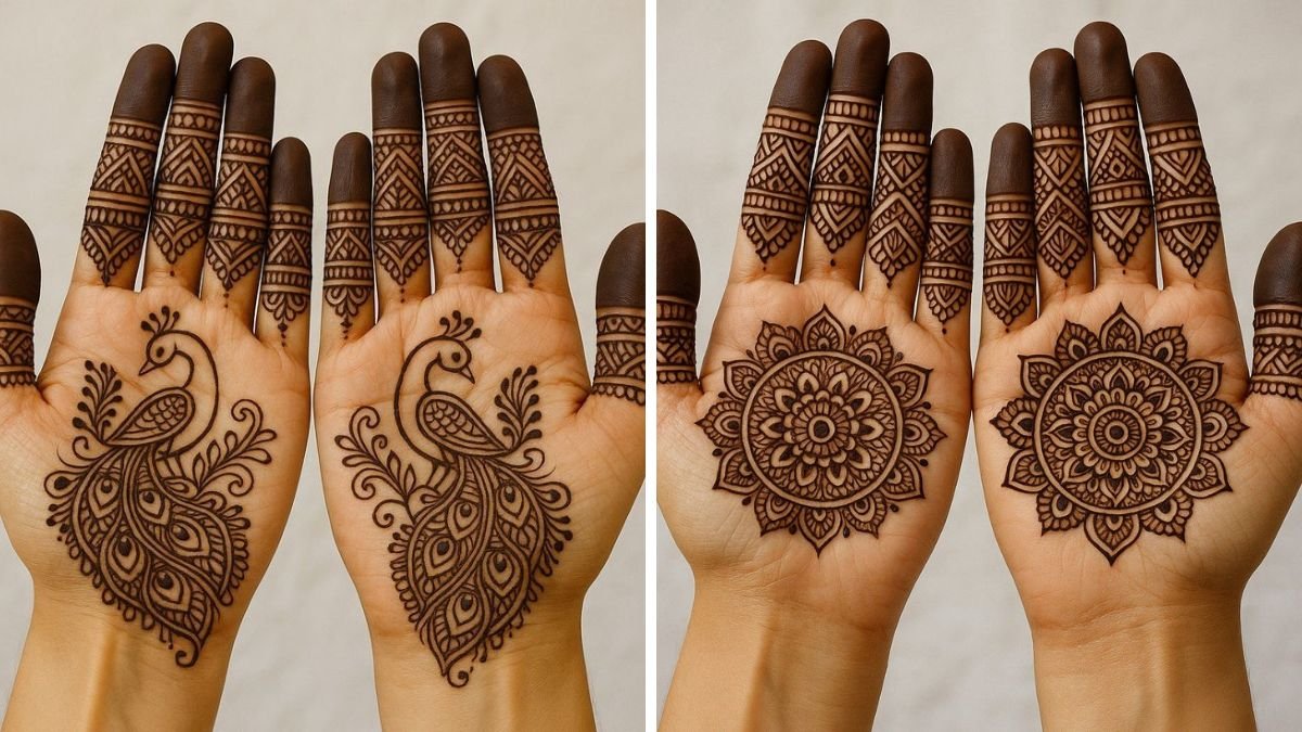 तुलसी विवाह जैसे शुभ अवसर पर हाथों को सजाने के लिए ये मेहंदी डिजाइन्स एकदम परफेक्ट हैं। एक डिजाइन में खूबसूरत मोर का पैटर्न पारंपरिक लुक देता है, जबकि दूसरी में मंडला आर्ट का डिजाइन मॉडर्न लगता है।