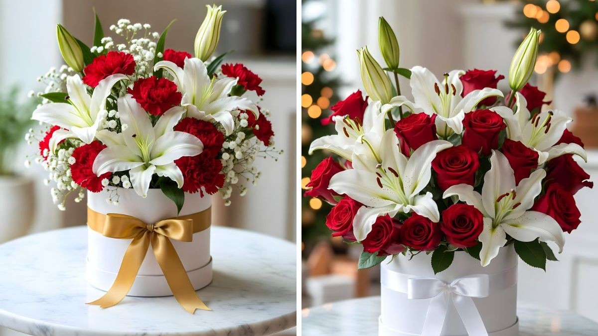 लाल गुलाब और सफेद लिली वाला बुके