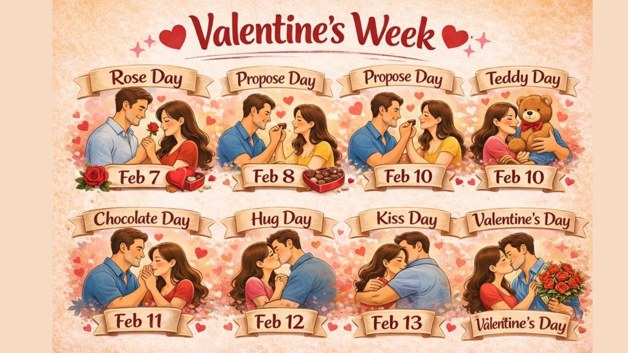 Valentine Day Week List 2026: जिसका इंतजार प्रेमी जोड़े लंबे समय से कर रहे थे आखिरकार वो वक्त आने ही वाला है। 2026 में प्यार करने वालों के लिए प्यार भरा सप्ताह यानी वैलेंटाइन वीक 7 फरवरी से शुरू होने जा रहा है। यह सप्ताह प्यार करने वालों के लिए बेहद खास होता है। इसमें लोग अपने दिलों की भावनाओं का इजहार एक-दूसरे से करते हैं। जो लोग पहले से रिलेशनशिप हैं वो भी रोज डे, प्रपोज डे, चॉकलेट डे, टेडी डे, प्रॉमिस डे, हग डे और किस डे को अपने-अपने अंदाज में सेलिब्रेट करते हैं। ऐसे में कोई भी दिन आपसे मिस न हो जाए इसके लिए यहां हम रोज डे से लेकर वैलेंटाइन डे तक की लिस्ट शेयर कर रहे हैं।