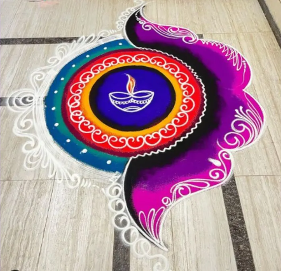 आप इस मौके पर दीये की डिजाइन में रंगोली बना सकते हैं। इस पर आप फूल का भी डिजाइन दे सकते हैं, जो देखने में काफी अच्छा लगेगा। आंगन में बनाने से पूरे घर में रौनक आ जाएगी।