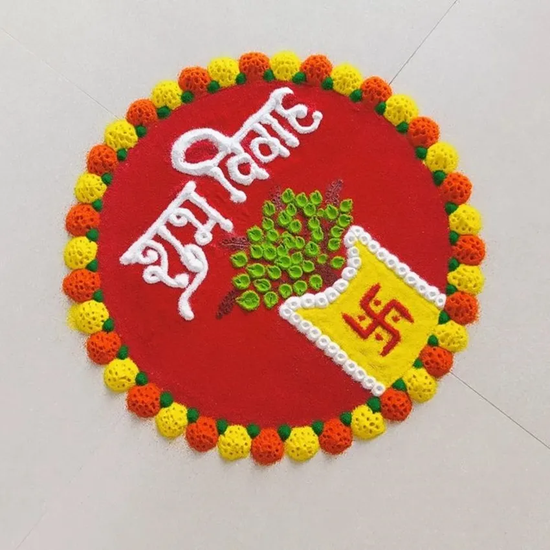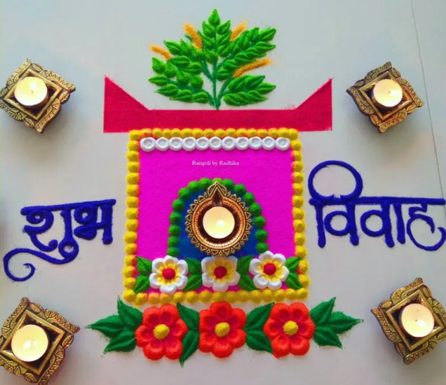 शादी के मौके पर आप शुभ विवाह वाले इस रंगोली को बना सकते हैं। यह देखने में काफी सुंदर लगेगा। इसको आसानी से बनाने के बाद आप इसके चारों और दीये जला सकते हैं। यह देखने में और भी भव्य लगेगा।