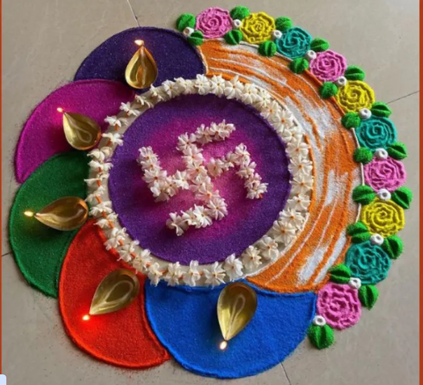 आप शुभ विवाह वाले इस गोलाकार रंगोली को भी बना सकते हैं। यह दरवाजे के मेन गेट पर काफी यूनिक लगेगा।