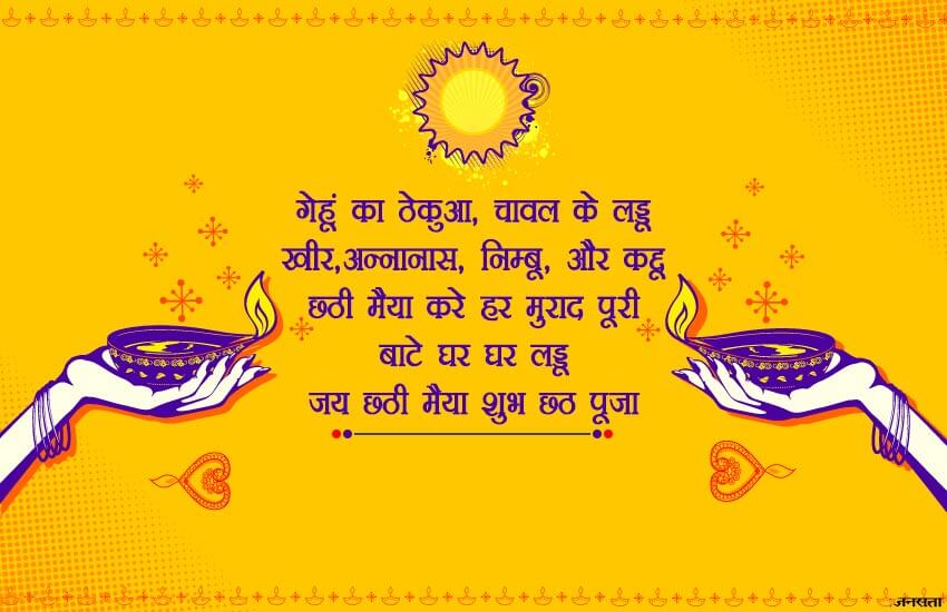 छठ पूजा को लेकर मान्यता है कि जो व्यक्ति इन दिनों छठ माता की पूजा करता है, छठ माता उनकी संतानों की रक्षा करती हैं। छठ व्रत रखने वाले लोग दो दिनों तक निर्जल व्रत रखते है। इस दिन लोग एक-दूसरे को छठ पूजा की बधाई देते हैं और शुभकामना संदेश भेजते हैं। आप भी अपने करीबियों को इन स्पेशल मैसेज, एसएमएस, वॉलपेपर और फोटोज के जरिए शुभ संदेश भेजकर विश कर सकते हैं।