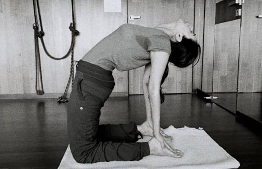 सबसे पहले योगा मैट पर घुटनों के बल बैठ जाएं और फिर घुटने को कूल्हे की चौड़ाई के बराबर फैला लें। अब घुटने के बल खड़े हो जाएं। सांस लेते हुए पीछे की तरफ झुकें और फिर दाईं हथेली को दाईं एड़ी पर और बाई हथेंली को बाईं एड़ी पर रखें। पीछे झुकते वक्त गर्दन को जोर से झटका ना दें वरना मोंच आ सकती है। अब धीरे-धीरे सांस लें और सांस छोड़ें। अब लंबी सांस छोड़ते हुए पहले जैसी मुद्रा में वापस आ जाए।