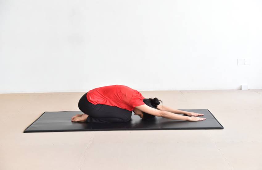 इस आसन को करने के लिए सबसे पहले पद्मासन की अवस्था में बैठ जाएं और रीढ़ की हड्डी को सीधा रखते हुए दोनों पैरों को फैल लें। दोनों हाथों को सिर के ऊपर ले जाएं और हाथों में कंधे की चौड़ाई जितनी दूरी बनाएं रखें। अब सांस छोड़ते हुएं और हाथों को सीधा रखते हुए कम से आगे की तरफ झुक जाएं। सांस लेते हुए शुरूआती में अवस्था में आ जाएं।