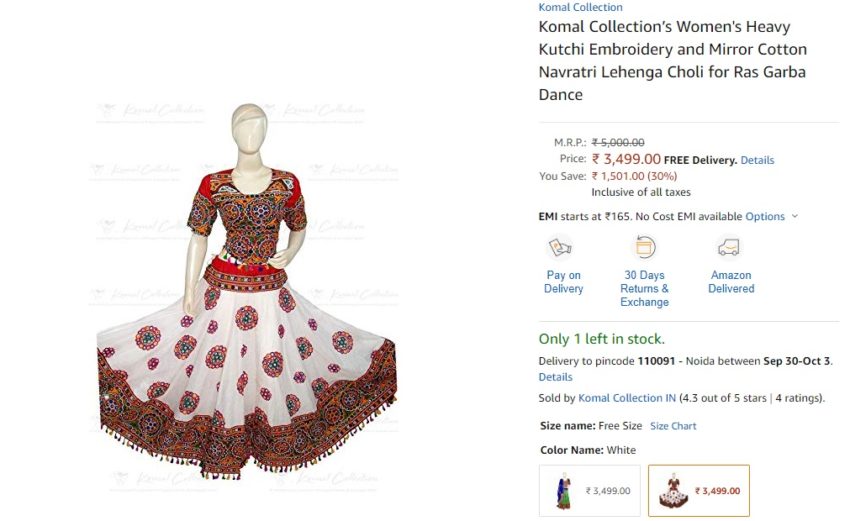 3. कोमल कलेक्शन की ये कुची एम्ब्रॉयडरी और शीशा लगा हुआ लहंगा आपको इस गरबा और डांडिया के मौके पर एक अलग लुक देगा। इस ड्रेस की कीमत 3499 रुपए है और यह आपको Amazon पर मिलेगा। सफेद और नारंगी कलर का यह लहंगा आपको और आकर्षित बना देगा।