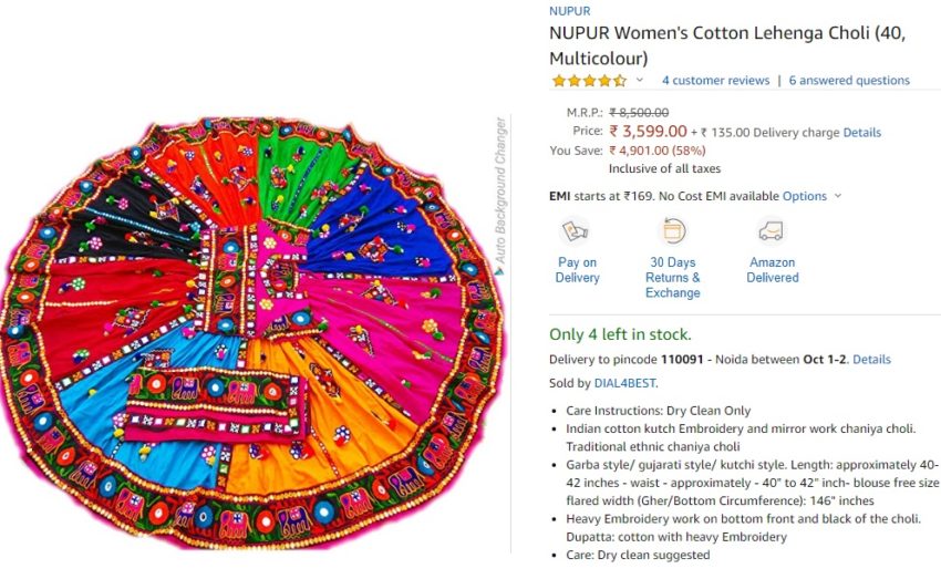2. नुपूर विमेंस का यह कॉटन लहंगा, चोली आपको Amazon पर मिल जाएगा। इस ड्रेस की कीमत 3599 रुपए है। यह मल्टीकलर लंहगा-चोली है। इस ड्रेस को 5 में से 4.5 स्टार भी मिले हुए हैं। गरबा और डांडिया के लिए यह एक परफेक्ट ड्रेस साबित हो सकती है। इसलिए जल्द ऑर्डर करें।