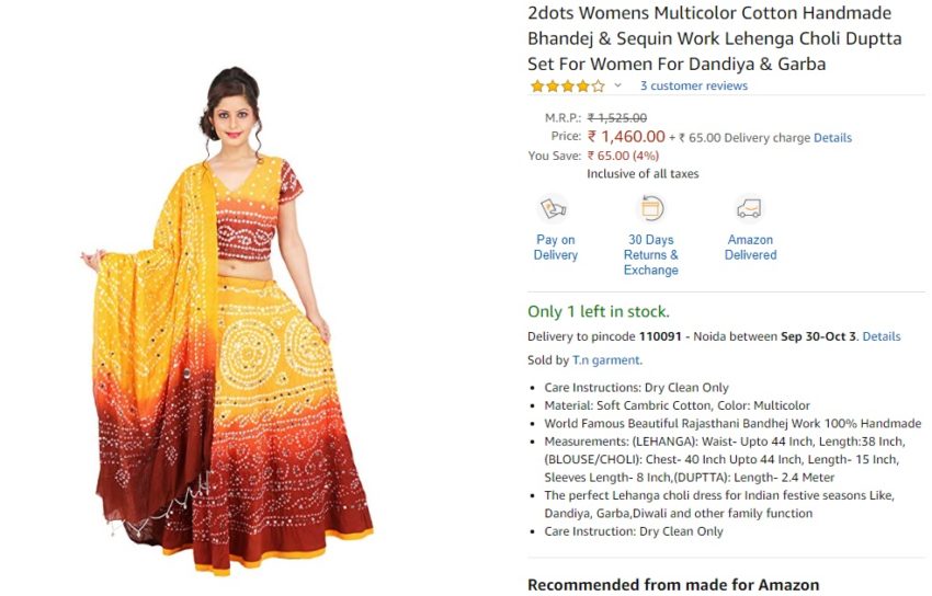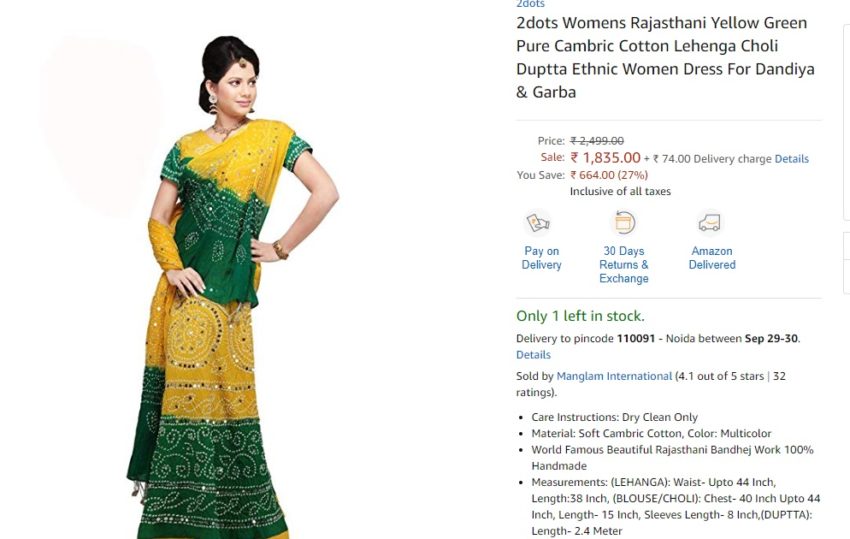 1. Amazon पर आपको बंधेज का यह लहंगा, चोली और दुपट्टा लगभग 1500 रुपए में मिलेगा। इस लंहगे का रंग पीले और ब्राउन कलर में है। डांडिया और गरबा के लिए यह ड्रेस काफी आकर्षित लगेगा। इसलिए देर मत कीजिए और जल्द ऑर्डर कीजिए।
