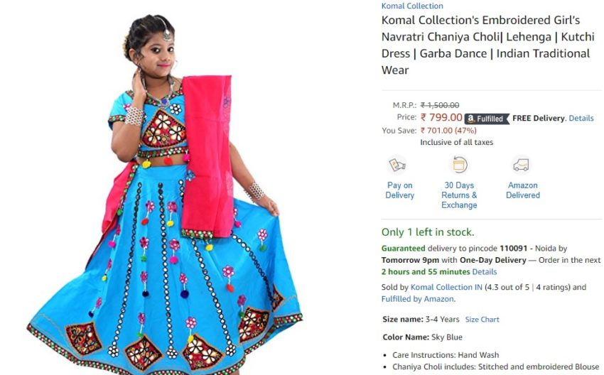 5. कोमल कलेक्शन की कढ़ाई वाली लड़की की नवरात्रि चनिया चोली लहंगा आपको Amazon पर 799 रुपए की मिल रही है। यह ड्रेस सस्ती भी है और दिखने में सुंदर भी। इसे पहन कर आपको एक अलग लुक मिलेगी।