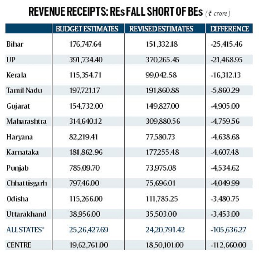 -सभी राज्यों (असम को छोड़कर) में चालू वित्त वर्ष में उनकी राजस्व प्राप्तियां घट गई हैं। उदाहरण के लिए, बिहार ने अपनी राजस्व प्राप्तियों में लगभग 25,500 करोड़ रुपये की कमी देखी है। यह बजट अनुमानों में लगभग 14 प्रतिशत की गिरावट है।