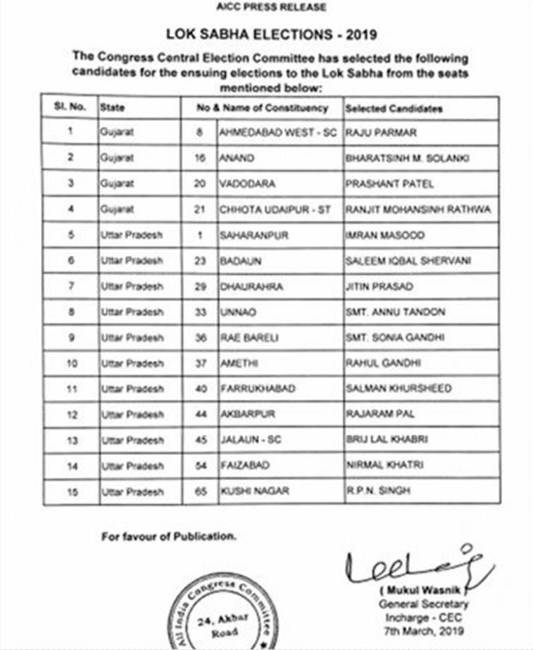 बता दें कि सपा और बसपा के गठबंधन ने पहले ही यह ऐलान कर दिया है कि वे अमेठी और रायबरेली से अपना प्रत्याशी नहीं उतारेंगे। उधर, कांग्रेस ने पांच बार के सांसद सलीम इकबाल शेरवानी को बदायूं से उतारा है। कांग्रेस के यूपी प्रत्याशियों में फरूखाबाद से सलमान खुर्शीद, धरौरा से जितिन प्रसाद, कुशीनगर से आरपीएन सिंह, उन्नाव से अन्नू टंडन, फैजाबाद से निर्मल खत्री, जालौन से बृजलाल, सहारनपुर से इमरान मसूद और अकबरपुर से राजाराम पाल शामिल हैं। वहीं, गुजरात की बात करें तो पूर्व प्रदेश कांग्रेस अध्यक्ष भारत सिंह सोलंकी आणंद से, राजू परमार अहमदाबाद पश्चिम से, प्रशांत पटेल वड़ोदरा से जबकि रंजीत मोहन सिंह रठवा छोटा उदयपुर सीट से कांग्रेस के टिकट पर किस्मत आजमाएंगे।