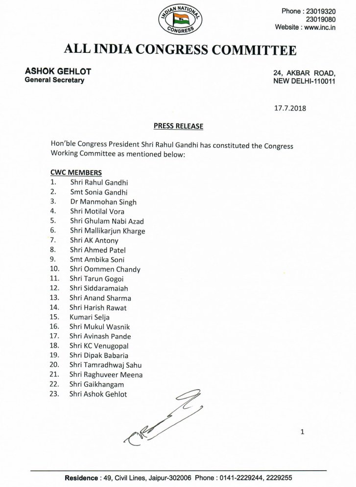 कांग्रेस ने मंगलवार (17 जुलाई) को नई वर्किंग कमेटी (सीडब्ल्यूसी) का ऐलान कर दिया। पार्टी ने इसमें कुल 51 सदस्यों को शामिल किया है, जबकि जर्नादन द्विवेदी सरीखे कई बड़े नामों को बाहर का रास्ता दिखाया गया। कांग्रेस अध्यक्ष बनने के बाद राहुल गांधी की बनाई हुई यह पहली सीडब्ल्यूसी है, जिसमें पहली बार राज्य के प्रभारियों को स्थाई आमंत्रितों के तौर पर रखा गया है। सीडब्ल्यूसी की बैठक 22 जुलाई को होगी।