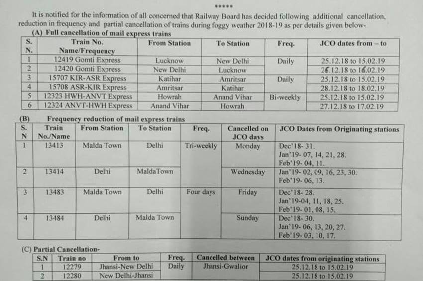 कई राज्यों में शीतलहर और कोहरा का असर बढ़ रहा है। कोहरे की मार ट्रेनों की रफ्तार पर भी पड़ी है। जबरदस्त कोहरे की वजह से रेलवे विभाग ने 6 ट्रेनों को रद्द कर दिया है। इन ट्रेनों को अभी 10 दिनों तक के लिए रद्द किया गया है। जिन ट्रेनों को रद्द किया गया है उनकी पूरी जानकारी यहां देखें-