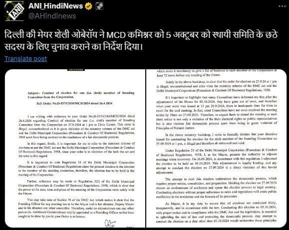 Aaj Ki Taaja Khabar LIVE: MCD स्टैंडिंग कमेटी सदस्य चुनाव पर दिल्ली की मेयर शैली ओबेरॉय ने कहा कि कल रात को उपराज्यपाल के निर्देश पर कमिश्नर द्वारा एक आदेश जारी किया गया कि ‘आज 1 बजे स्थायी समिति के 6वें सदस्य का चुनाव होगा’… वह आदेश पूरी तरह से अवैध है। DMC एक्ट की धज्जियां उड़ाई गई हैं… उपराज्यपाल के पास किसी भी प्रकार की शक्ति नहीं है कि वे हाउस की मीटिंग में हस्तक्षेप कर पाएं… कल भी भाजपा ने चुनाव प्रक्रिया में खलल डाली… कल मजबूरन मुझे सदन 5 तारीख तक स्थगित करना पड़ा। अगर हम कानून की बात करें तो वैध चुनाव 5 अक्टूबर को ही होंगे… मेयर होने के नाते मेरी जिम्मेदारी बनती है कि चुनाव स्वतंत्र और निष्पक्ष रूप से हों… भाजपा को समझना होगा कि नगर निगम में इस तरह की तानाशाही नहीं चलेगी। भाजपा की क्या मंशा है कि कल रातों-रात चुनाव करवाने की कोशिश की गई?… “