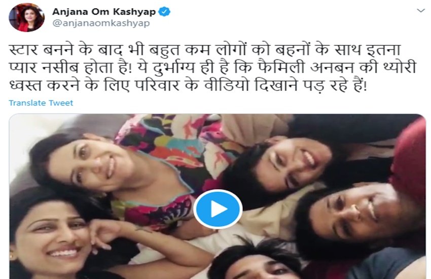 टीवी न्यूज एंकर अंजना ओम कश्यप अपने एक ट्वीट के बाद सोशल मीडिया यूजर्स के निशाने पर आ गई हैं। उन्होंने रविवार (16 अगस्त, 2020) को परिवार के साथ सुशांत सिंह राजपूत (SSR) का एक पुराना वीडियो शेयर करते हुए लिखा, ‘स्टार बनने के बाद भी बहुत कम लोगों को बहनों के साथ इतना प्यार नसीब होता है। ये दुर्भाग्य ही है कि फैमिली अनबन की थ्योरी ध्वस्त करने के लिए परिवार के वीडियो दिखाने पड़ रहे हैं।’ पुराने वीडियो में एसएसआर अपने बहनों के साथ हंसी-मजाक करते हुए नजर आ रहे हैं। वीडियो में बहन मजाक में सुशांत को ‘महेंद्र सिंह धोनी’ कहती हुई नजर भी आती हैं।