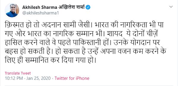 न्यूज चैनल एनडीटीवी के पत्रकार अखिलेश शर्मा ने भी अदनान सामी को पद्मश्री दिए जाने पर प्रतिक्रिया दी है। उन्होंने शनिवार को ट्वीट कर लिखा, ‘किस्मत हो तो अदनान सामी जैसी। भारत की नागरिकता भी पा गए और भारत का नागरिक सम्मान भी। शायद ये दोनों चीजें हासिल करने वाले वे पहले पाकिस्तानी हों। उनके योगदान पर बहस हो सकती है। हो सकता है उन्हें अपना वजन कम करने के लिए ही सम्मानित कर दिया गया हो।’