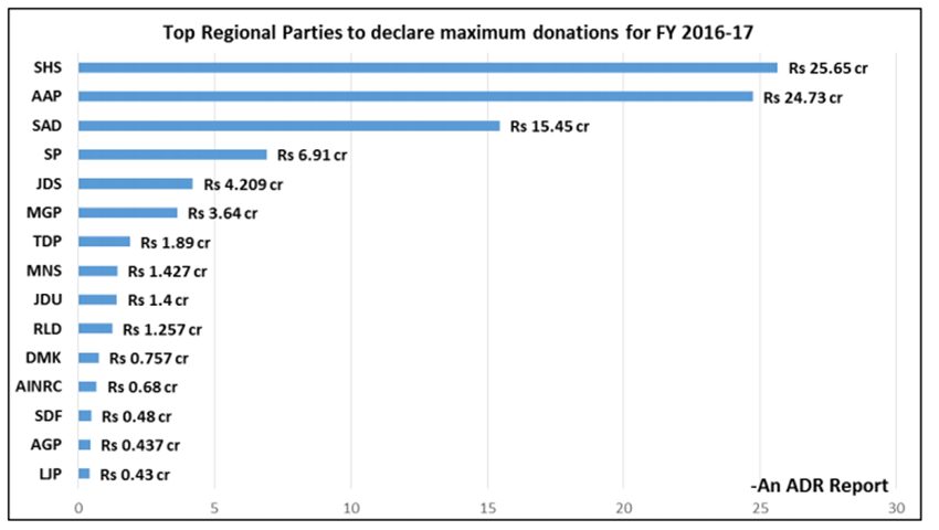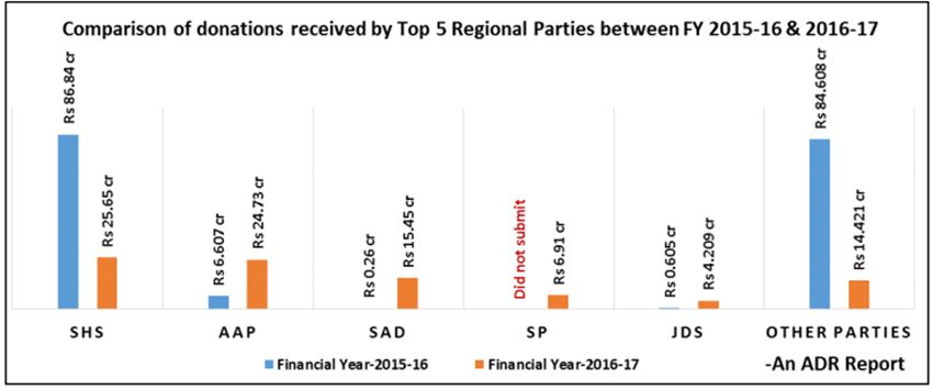2015-16 में शिव सेना को 86.84 करोड़ चंदा मिला था जो 2016-17 में घटकर 25.65 करोड़ रह गया। आप को 2015-16 में 6.07 करोड़ रुपये चंदा मिले थे जो एक साल में बढ़कर साल 2016-17 में 24.73 करोड़ रुपये हो गया।
